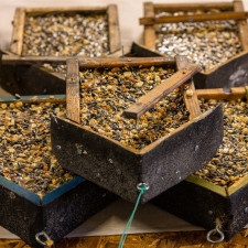 Als weitere Unterstützungsmaßnahme werden Futtereimer mit Weizen und Mais entlang von Ackerflächen aufgestellt, um eine zusätzliche Nahrungsquelle zu schaffen.