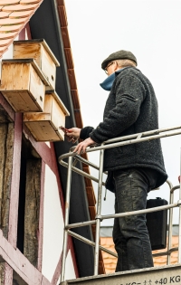 An zahlreichen Häusern in Ober-Mockstadt wurden mit Hilfe eines Hubwagens die Mauerseglerkästen und Schwalbennester überprüft und gesäubert. Die Reinigung ist wichtig, da sowohl Schwalben als auch Mauersegler sehr brutplatztreu sind und jedes Jahr zu ihren bekannten Nistplätzen zurückkehren. Zusätzlich montierten die Naturfreunde mehrere selbst gebaute neue Nisthilfen, um weiteren Brutpaaren geeignete Plätze zu bieten.