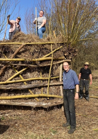 Bei strahlendem Sonnenschein ging die Arbeit besonders gut von der Hand. Die zuvor gemähten Flächen wurden abgerecht, um neuen Aufwuchs zu ermöglichen. Zudem wurden die Äste der geschnittenen Heckensträucher auf die Benjeshecke aufgesetzt, Wildkräuter in der Sitzecke gejätet und mehrere Schilder erneuert.