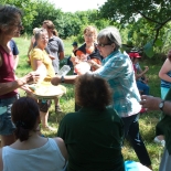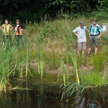 Bei schönstem Sommerwetter machten sich die Naturfreunde auf den Weg zum Biohof von Helmut Keller in Konradsdorf. Der Wald Richtung Effolderbach bot den 23 Wanderern Schatten und Abkühlung auf dem größten Teil der Wegstrecke. Mit gut gekühlter Frischmilch begrüßte Helmut Keller die Ober-Mockstädter während Brötchen der Firma Käsespezialitäten Wahl die Brotzeit komplettierten. Gut gestärkt folgten die Naturfreunde den Ausführungen des Biolandwirts Keller, der von seinen landwirtschaftlichen Ursprüngen in den 80er Jahren in Ober-Mockstadt berichtete. 1992 zog er schließlich mit 20 Milchkühen im Gepäck in das Kloster Konradsdorf, wo er seither mit seiner Familie seinen Ackerbau- und Milchviehbetrieb leitet. Heute hat er etwa 170 Kühe, die tagsüber auf den Nidderwiesen weiden und zusätzlich mit eigenproduziertes Feldfutter wie Kleegras und im Winter mit Gras- und Maissilage gefüttert werden. Zurzeit werden Milch und Eier ab Hof vermarktet, wobei das Sortiment in einem im Bau befindlichen Hofladen zukünftig erweitert werden soll. Bei einem Rundgang konnte der Offenstall mit eingestreuter Liegefläche und Außenterasse besichtigt werden. Im Melkstand mit angeschlossener Milchkammer erklärte Keller die tägliche Gewinnung von etwa 3000 Litern Milch sowie die Kühlung, Abholung und Vermarktung. Vorbei am Abkalbestall und der Güllelagerung ging es zum tierischen Höhepunkt; den Kälbern. In den Außenboxen konnte man die Jungtiere aus nächster Nähe beobachten und streicheln. Helmut Keller bedankte sich für das Interesse und verabschiedete sich mit dem Wunsch viele als Kunden auf seinem Hof begrüßen zu dürfen.