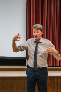 Roland Günter- hier beim Vortrag in Ober-Mockstadt- verbringt als „biologischer“ Fotograf oft viele Wochen mit seinen Protagonisten, den heimischen Tieren und Pflanzen, in deren Lebensräumen. Belohnt wird er mit einmaligen, spektakulären (Foto)Einblicken in deren Lebensweisen – abgesehen von den intensiven persönlichen Beziehungen und Freundschaften, die er mit Bienen, Wespen und Co. dabei schließt.