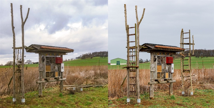 Rankhilfe am Insektenhotel: vor (links) und nach der Reparatur(klicken zum Vergrößern)